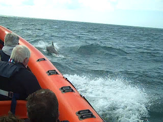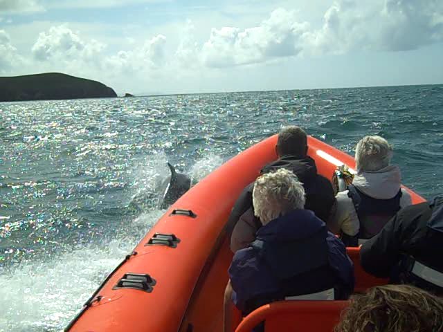 The great sightings continue. We spotted a couple of Gannets circling just east of Cardigan Island so we went to investigate. We stopped and whilst bouncing around a little waiting, a dolphin popped up for a breath about 2 metres away from us, giving us all a surprise. A pod of around 8 then stayed with us for the next 15 – 20 minutes. They didn’t appear to be feeding, just happy to hang around with the boat. We then decided to leave them in peace and headed off slowly (5 knots) back towards the island and they decided to follow us playing in our bow wave. I took some video footage which I’ll edit and try to post up to you tube. In the meantime here are a couple of stills. Not great quality but you get the idea. After a few minutes they left us and we continued to Cardigan island only to then spot Top Notch, one of our regular dolphins and her calf just by the island. After a few minutes watching we went off to find some seals and saw 4 – 5 around Cardigan Farm Park. Oops, forgot to mention, still plenty of Auks on the Island.